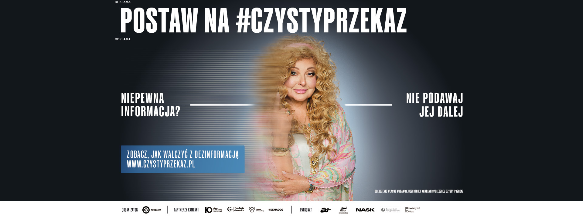 Kampania „Czysty przekaz” powstała z inicjatywy Fundacji PZU. Jest organizowana pod patronatem Prezydencji Polski w Radzie UE, Narodowego Instytutu Wolności, NASK, Centrum Badań nad Uprzedzeniami Uniwersytetu Warszawskiego oraz Centrum Badań nad Dezinformacją Collegium Civitas wspólnie z organizacjami społecznymi: Fundacją Dbam o Mój Zasięg, Fundacją Geremka, Fundacją Szkoła z Klasą oraz Stowarzyszeniem Demagog. Kampania trafi do odbiorców za pośrednictwem telewizji, radia, mediów internetowych i prasy, dzięki połączeniu sił i zaangażowaniu patronów medialnych takich jak: Grupa Agora, POLITYKA, Ringier Axel Springer Polska, TVN Warner Bros. Discovery oraz Wirtualna Polska. Za koncept kreatywny i produkcję kampanii odpowiada agencja Stor9.